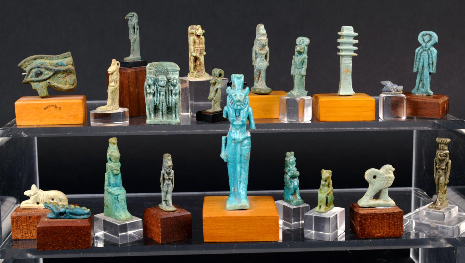 mainly faience, including two lion headed goddess walking figures, another seated, two Thoeris figures, three falcon headed, a ram headed figure, two female deities, a triad amulet, a seated deity with a double crown, an udjat eye, a falcon, a recumbent jackal, a crocodile, a tit or girdle of Isis amulet, a djed pillar and a lapis lazuli frog,
