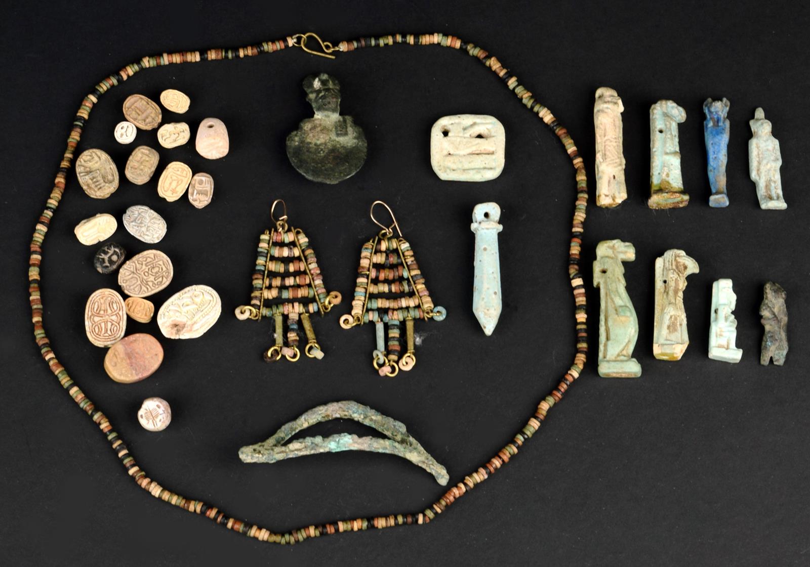 including five walking deities; ram, ibis, falcon, Thoeris and lion; a pierced Udjat eye, a papyrus sceptre, a jackal, a seated deity, a pair of bead earrings, a bead necklace, a bronze eye, a bronze lion head goddess, a bronze lion head with a crown, thirteen scarab beads, the bases carved hieroglyphs, animals or patterns, and five beads with carved bases,