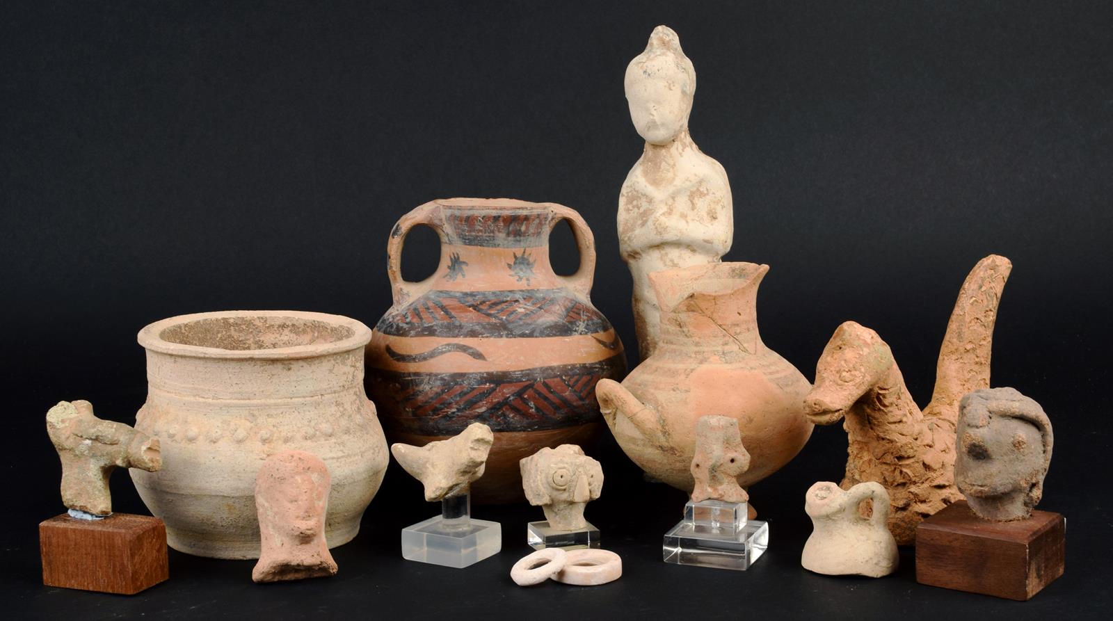 including four human votive heads, two animal heads, a bulbous vessel, a jug fragment, two shell rings, a banded two handled pot, a zodiac dragon, a standing figure and a pot,
