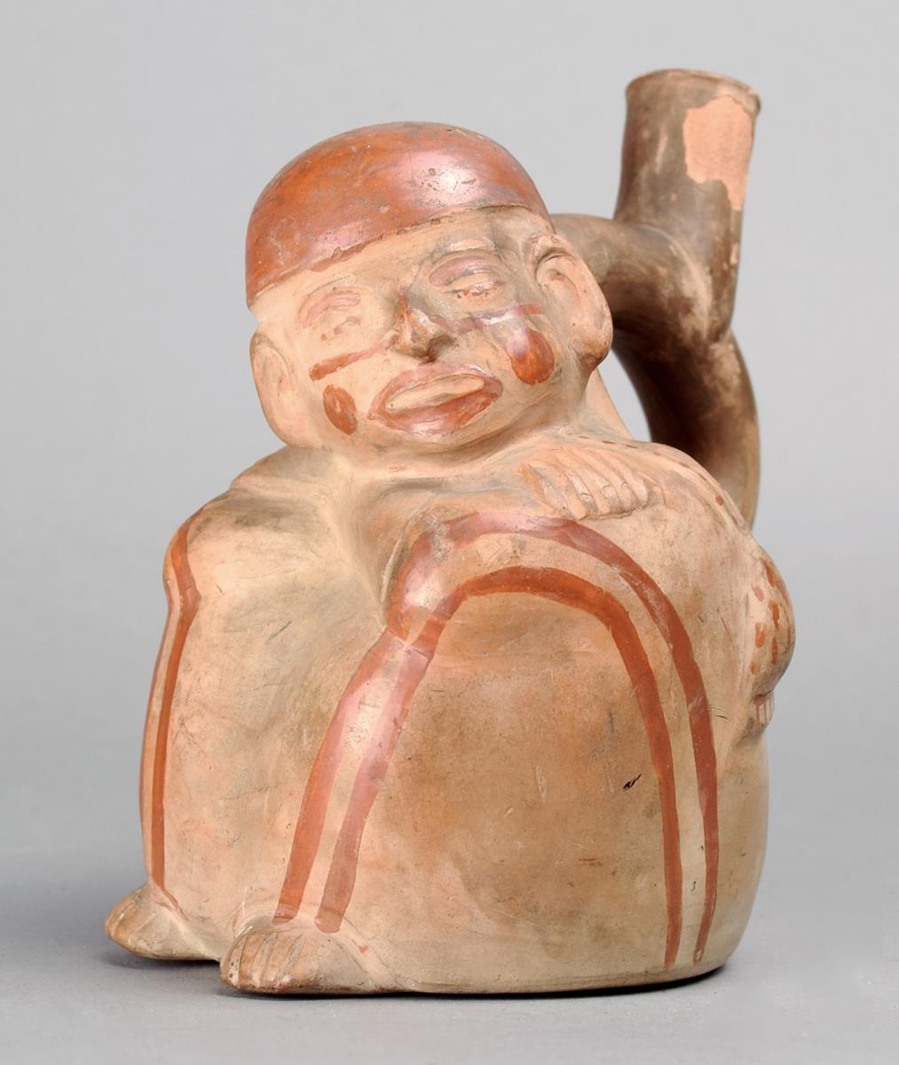 A Moche vessel Peru terracotta with a seated figure having a bag around his neck