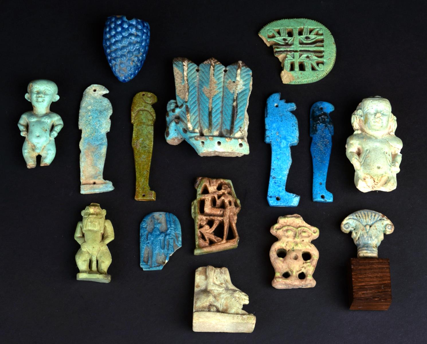 faience including two figures of Bes, two amulet figures of Pataikos, one with a scarab on its head and a falcon deity to the back, an Udjat eye disc, four flat deities, pierced for mounting, a feather plume with a monkey and three geese, a palmette finial, a fruit amulet, a recumbent lion fragment, a panel with three deities and a pierced panel with a figure,