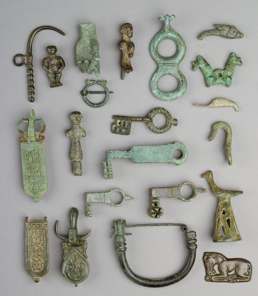 including three keys, a large bow fibula, a right hand, three figures, three clasps, a torque brooch, two duck head terminals, a bird finial, a key pendant, a Janus animal pendant and four other items,
