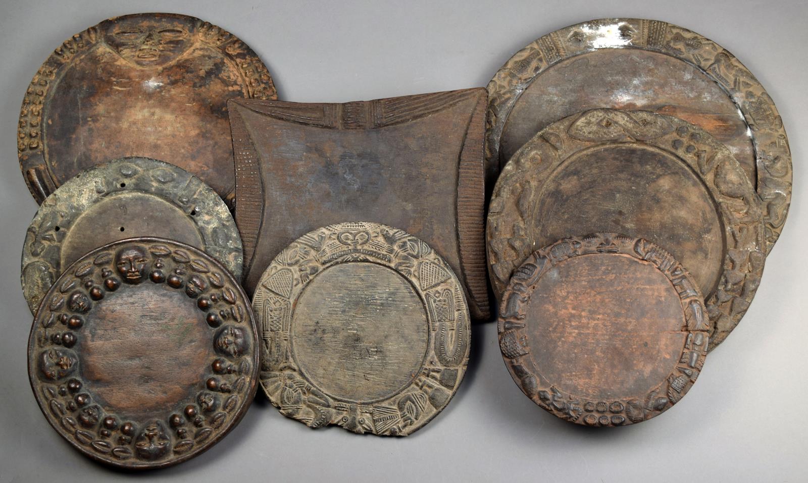 wood, seven circular with a carved mask, animals, shells and symbols, and one rectangular with concave sides,