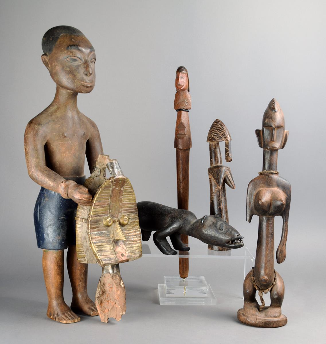 and a Bambara female figure, a Mossi doll, a Kota janus reliquary, a carved animal and a figural staff. (6)