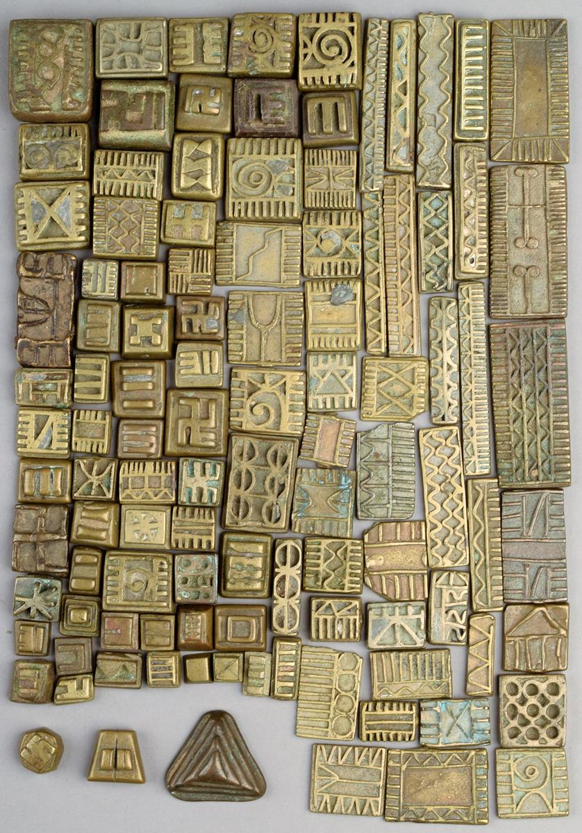 A collection of Ashanti gold weights Ghana brass with cast geometric designs