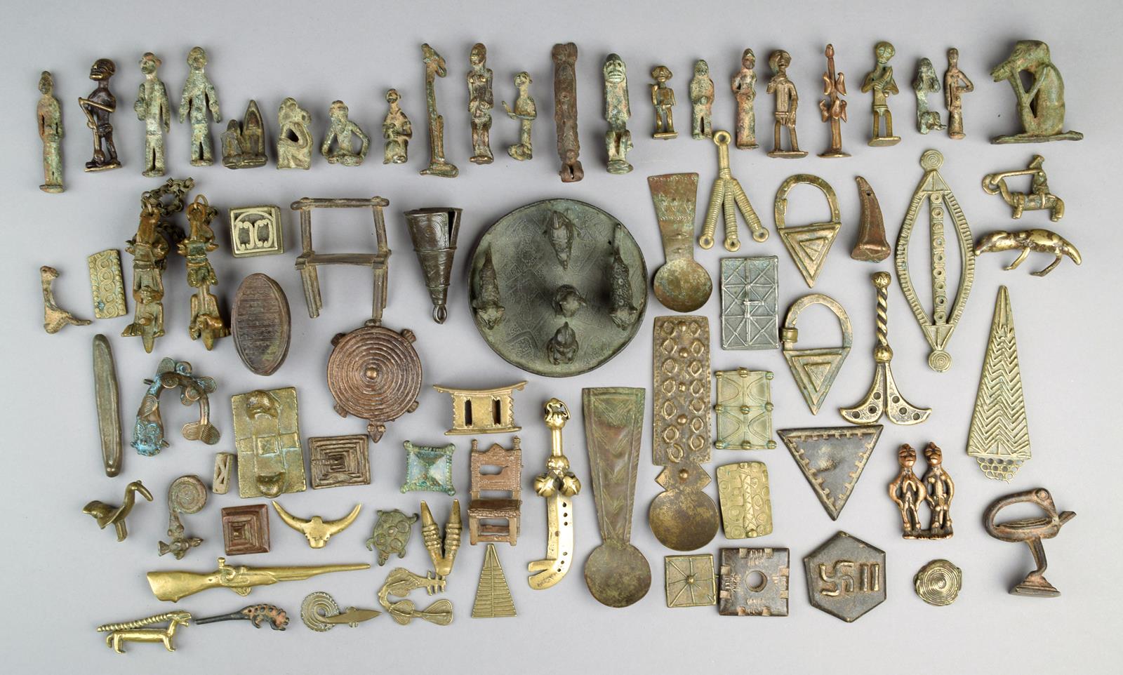 brass, including a sword, a stool, two chairs, three shields, geometric examples, animals and figures, together with three spoons, a kuduo lid with leopards, a cockerel, a seated dog and a kneeling figure and other West African brass items,