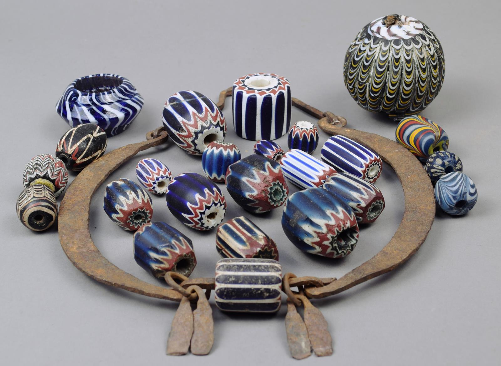 nine similar six-layer beads, and another on an iron neckpiece, together with eight various glass beads. (25)