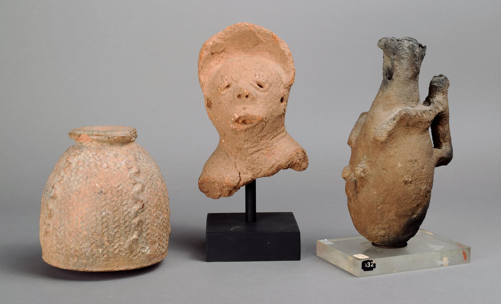 an anthropomorphic vessel, modelled as a mother with a child as the handle, 18cm high, on a stand and a Mali weight/smoother, with five snakes to the body, 11.5cm high. (5)