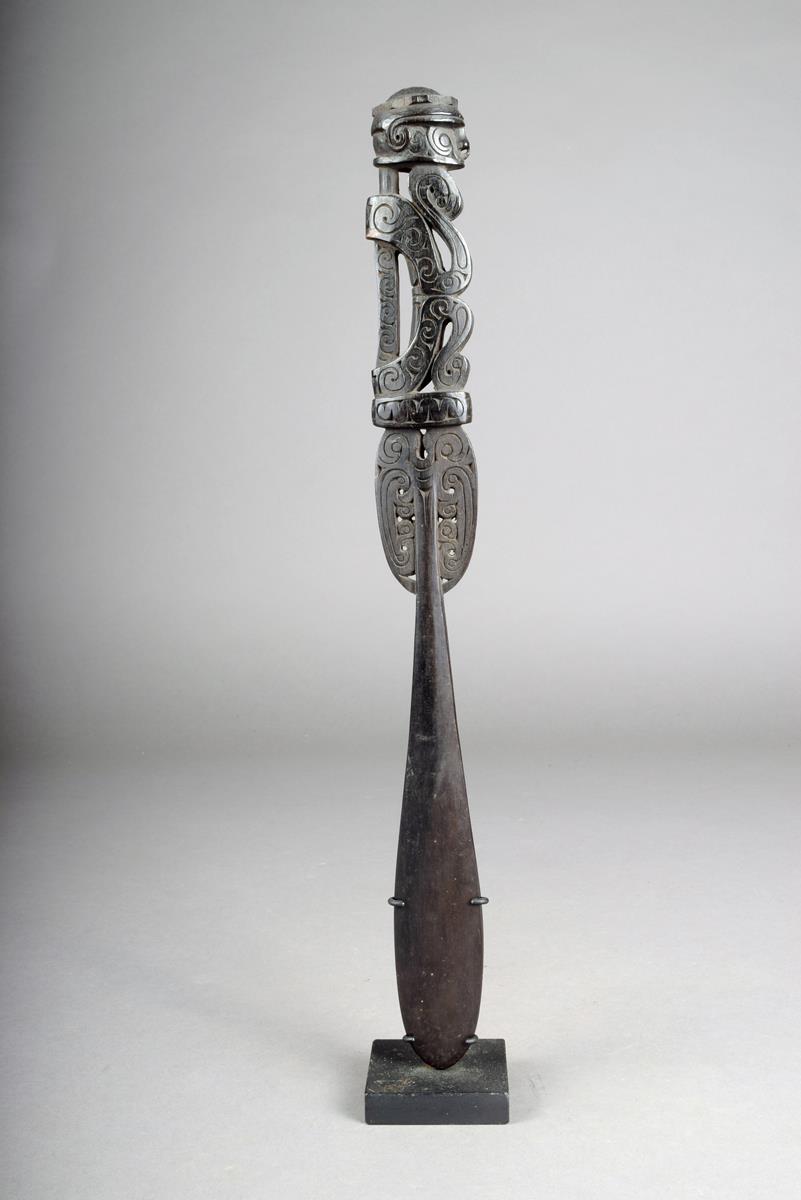 A Massim lime spatula Papua New Guinea with a stylised seated figure terminal