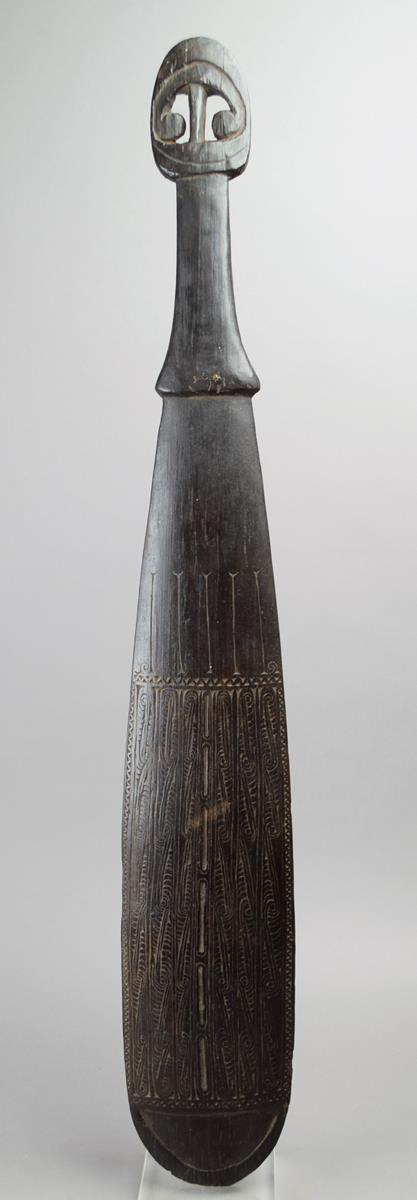 palmwood with a concave blade, incised scroll and zig-zag decoration and with a recessed panel rounded tip, the handle with a pierced stylized human or canoe form,