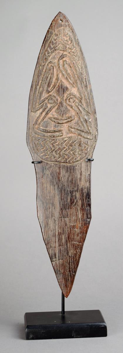 A Papuan Gulf bullroarer Papua New Guinea wood with a carved ancestor mask