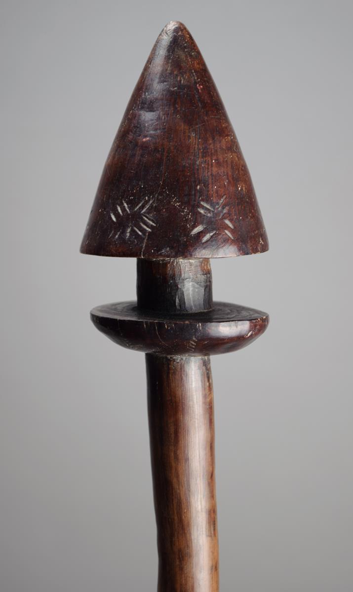 A Vanuatu club Melanesia wood with a conical finial with incised linear stars above a flange