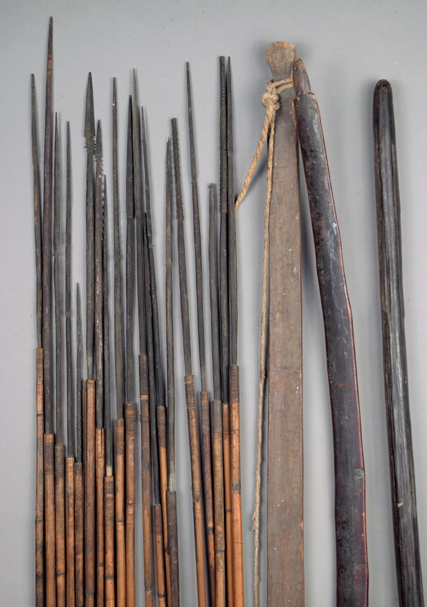 another bow, a palmwood spear and a collection of Oceanic arrows, with reed shafts and wood barbed tips. (23)