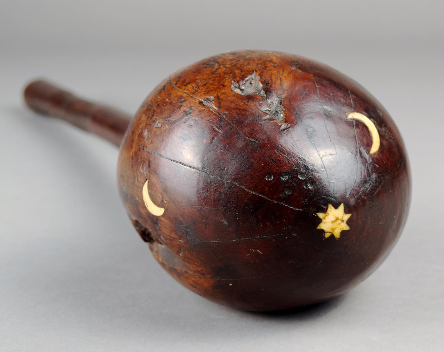 wood with bone inlay, the ovoid head with crescent moons and stars with a chevron incised grip and a four point star inlaid to the end,