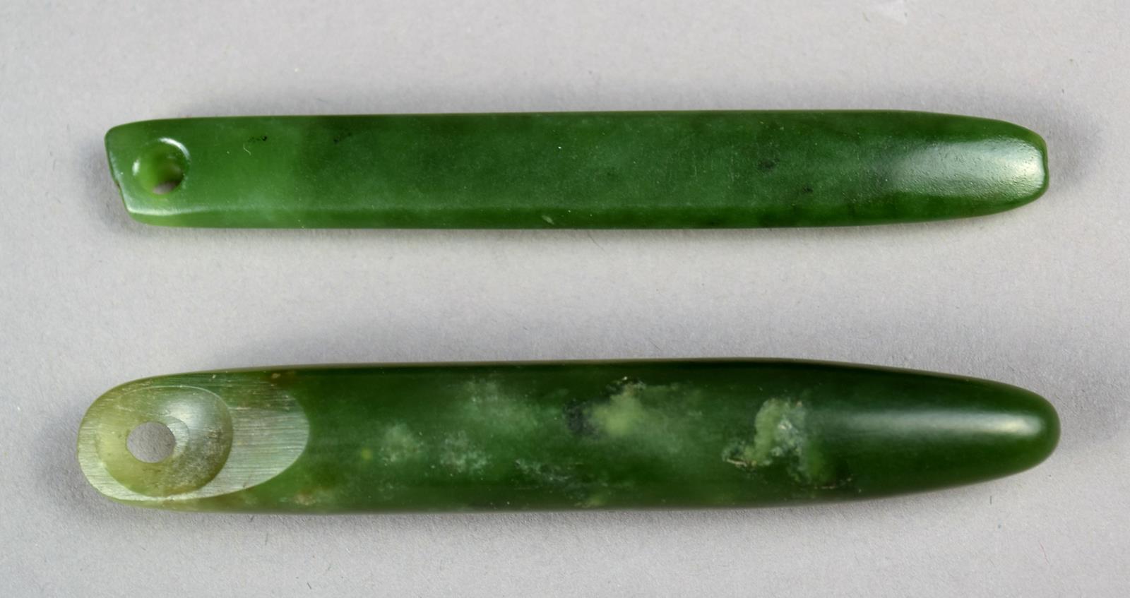 greenstone; one cylindrical with a tapering end, the other faceted, both with a suspension hole,