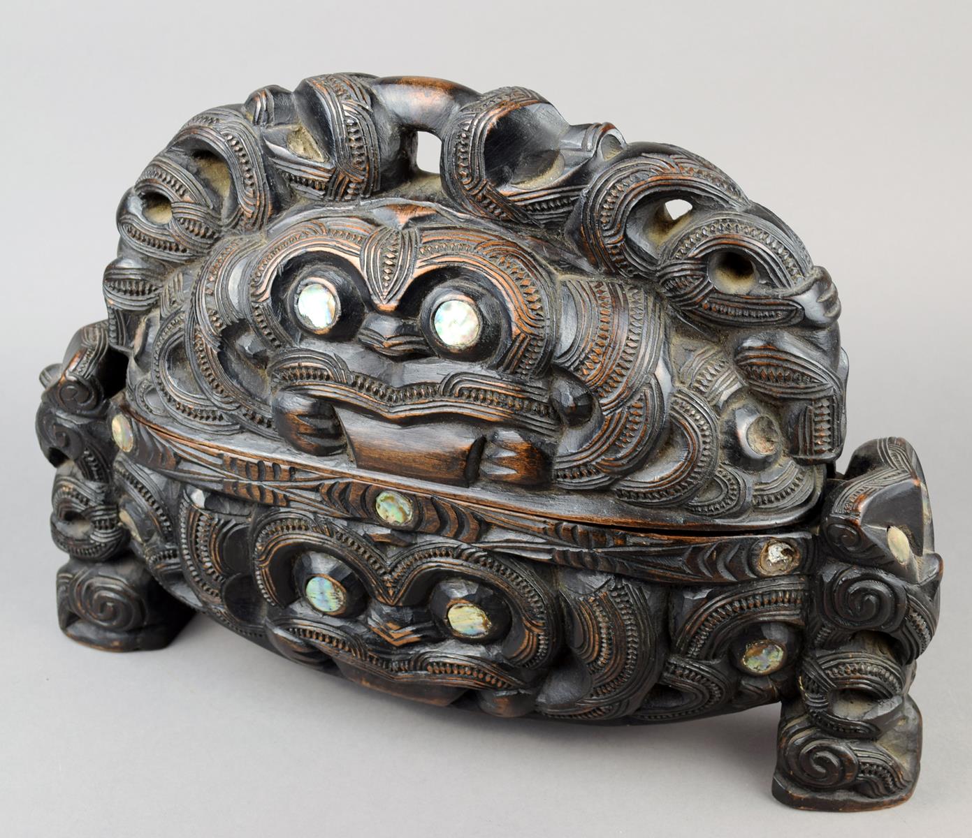 A Maori feather box and cover New Zealand wood with a dark stain and abalone shell inlay