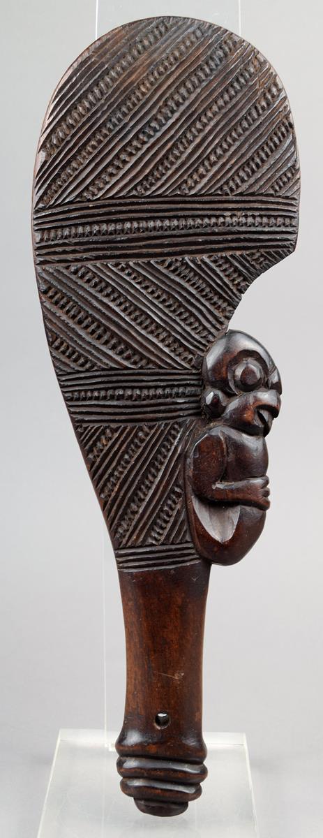 wood with linear and notch decoration to the blade with a tiki on the inside edge, the handle pierced for attachment and with a ribbed butt,