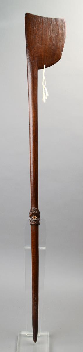 wood with a curved blade, pierced at the base, the tapering shaft with a relief carved Janus tiki head, with haliotis shell eyes, one missing,