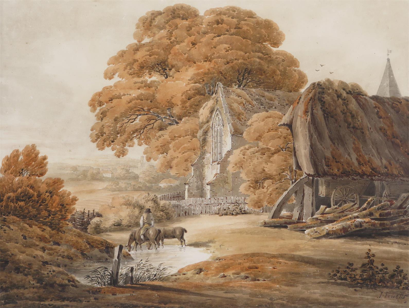 Joseph Powell (1780-1834) Figure by a thatched barn and church Signed Watercolour 44 x 59cm; 17½...