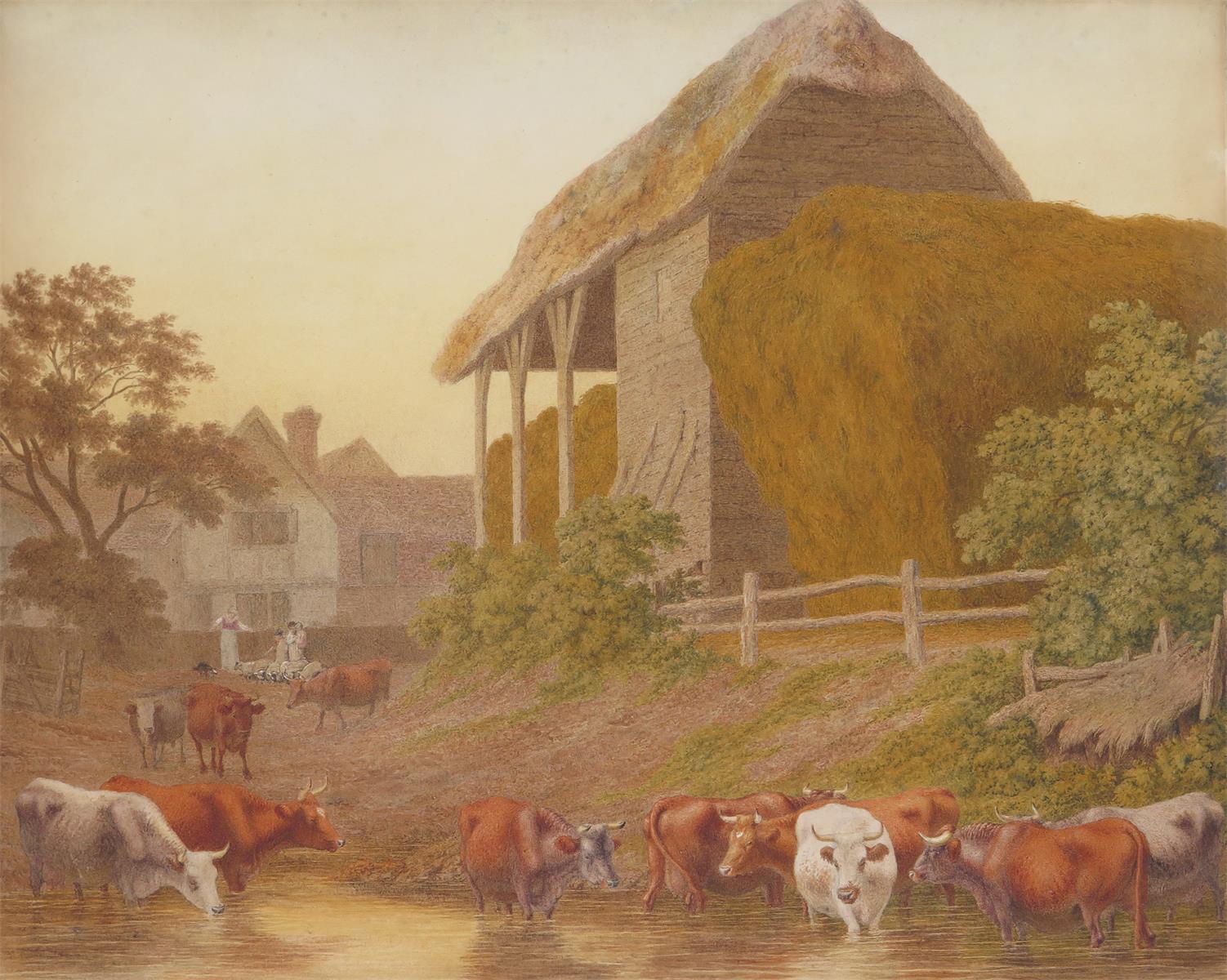 Robert Hills (1769-1844) Cattle watering by a farmstead and hay barn Watercolour 39 x 49cm; 15¼ x...