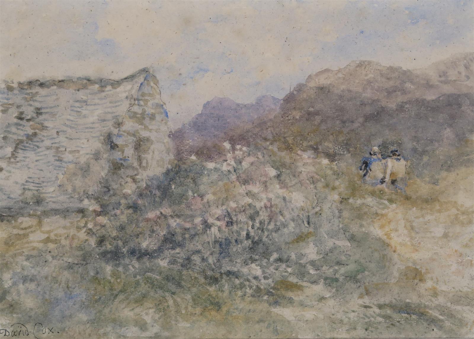 David Cox Snr. O.W.S. (1783-1859) Figures by a cottage on a moor Signed Watercolour 25 x 35cm; 10...