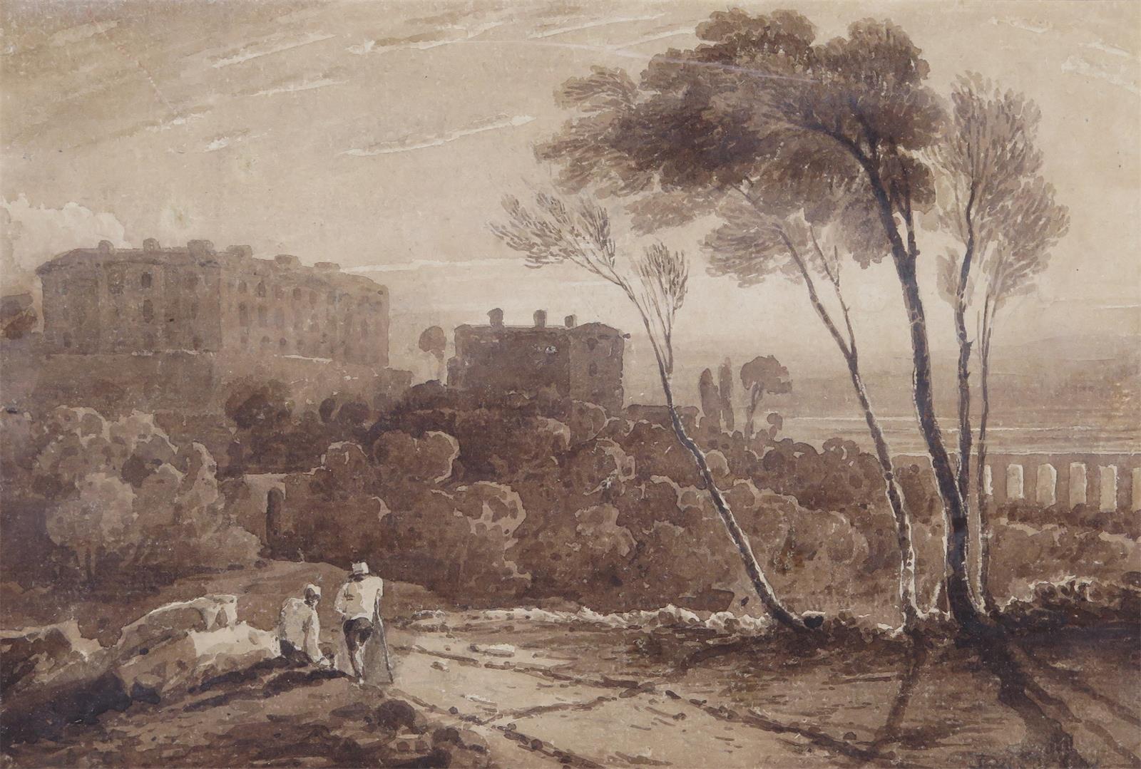 David Cox Snr. O.W.S. (1783-1859) Figures in a landscape with a bridge and buildings beyond...