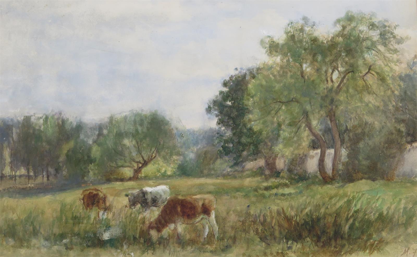 Mark Fisher R.A. (1841-1923) Cattle in a tree-lined meadow Signed with initials Watercolour 27.5...
