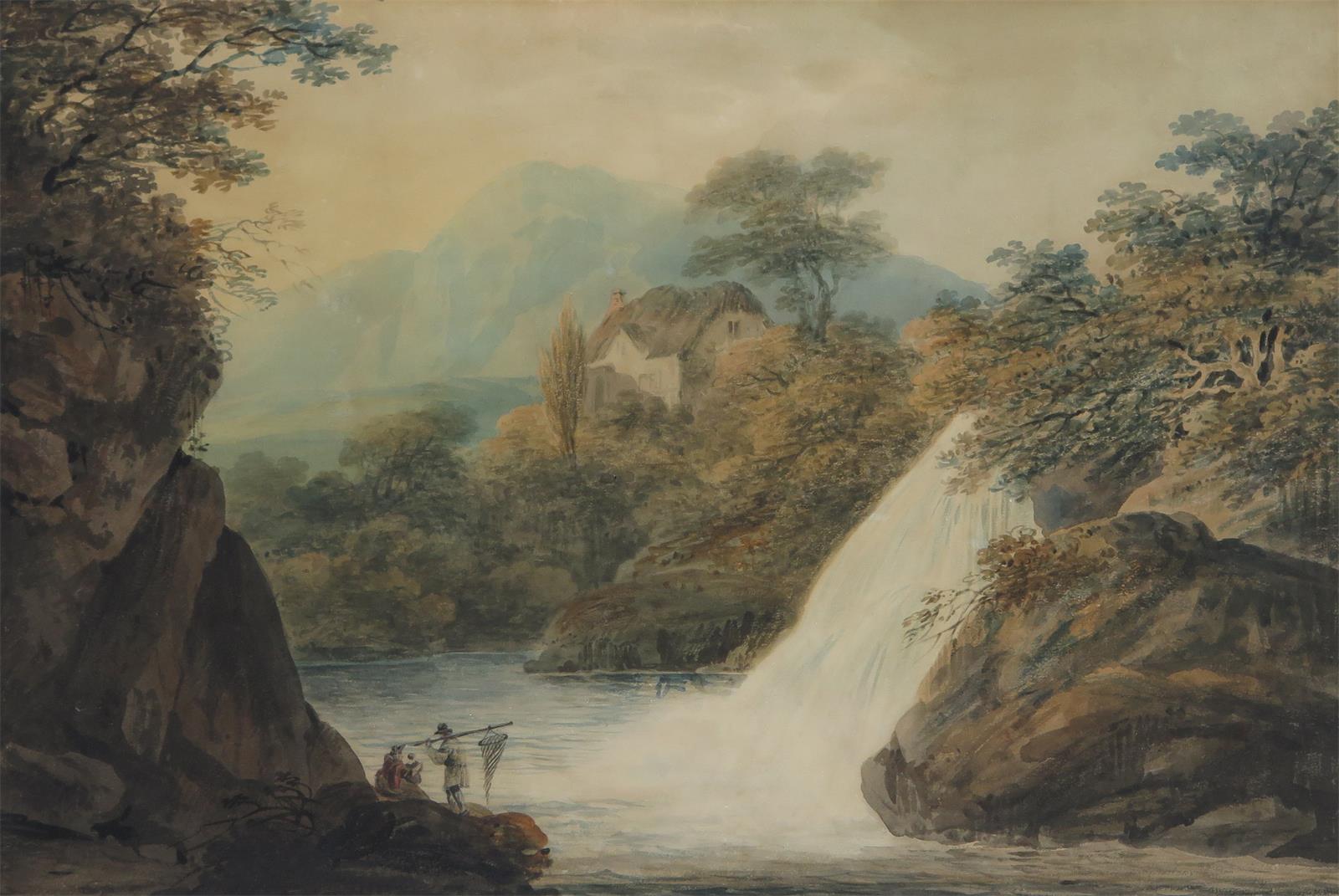 Nicholas Pocock (1740-1821) Fishermen by a waterfall Watercolour 38 x 57cm; 15 x 22½in...