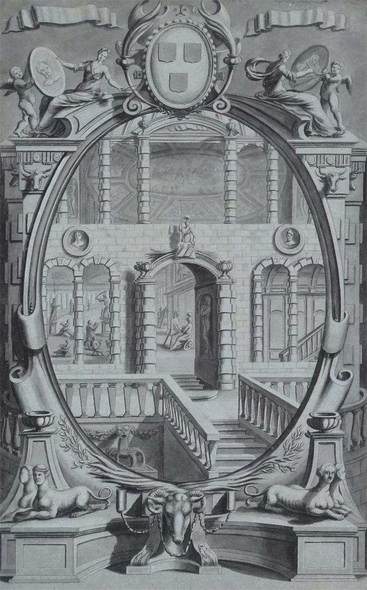 Manner of Hans Vredeman de Vries Architectural capriccio Grisaille watercolour on grey paper 38.5...