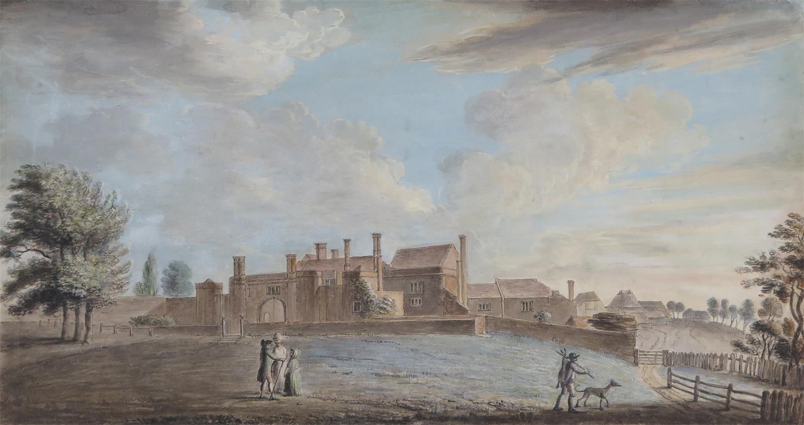 Henry Gilder (1743-1808) Elegant figures and a gamekeeper by a country house Watercolour 22.5 x...