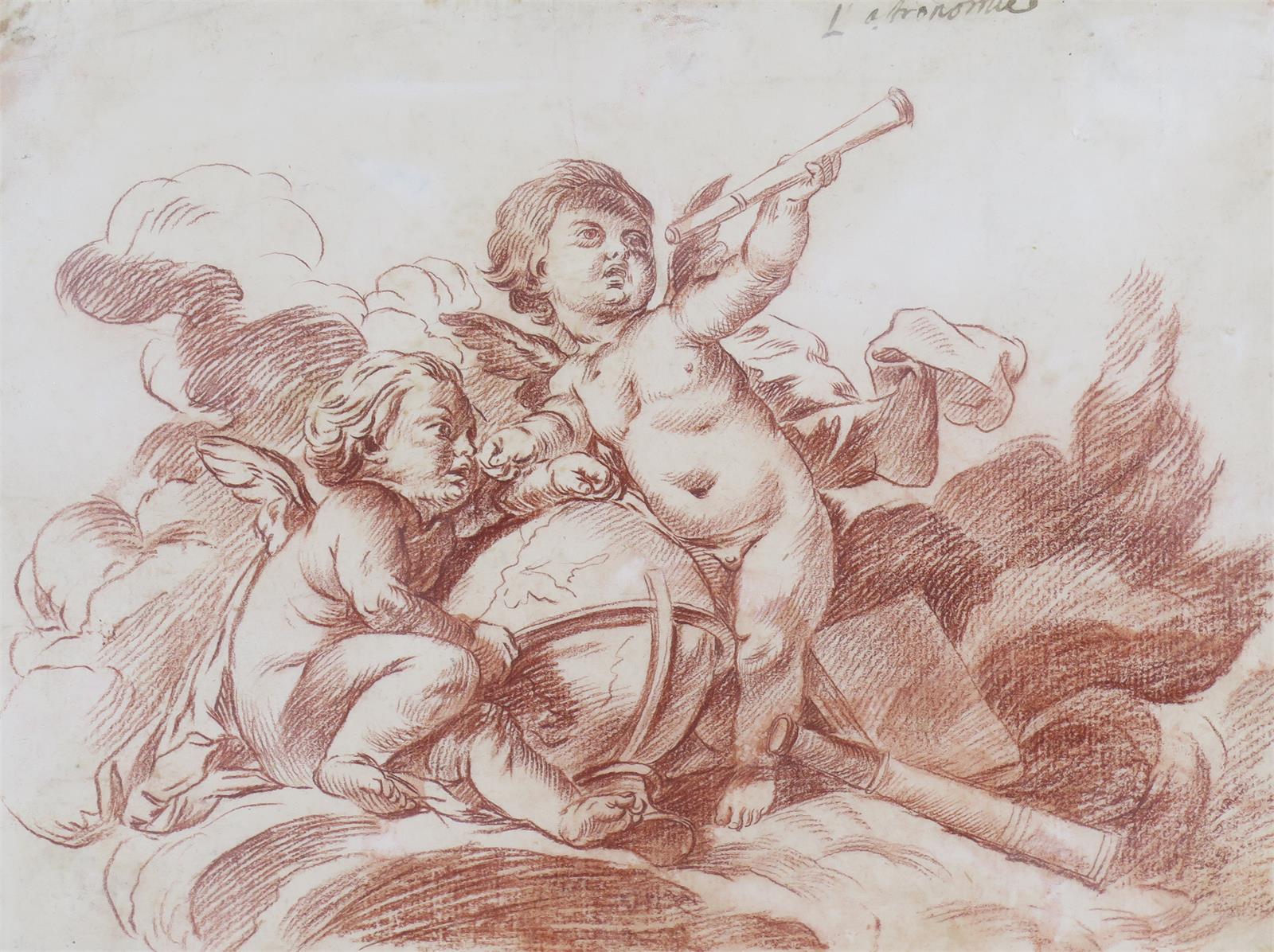 French School 18th Century Two putti with a globe and telescopes Inscribed L'Astronomie Red chalk...