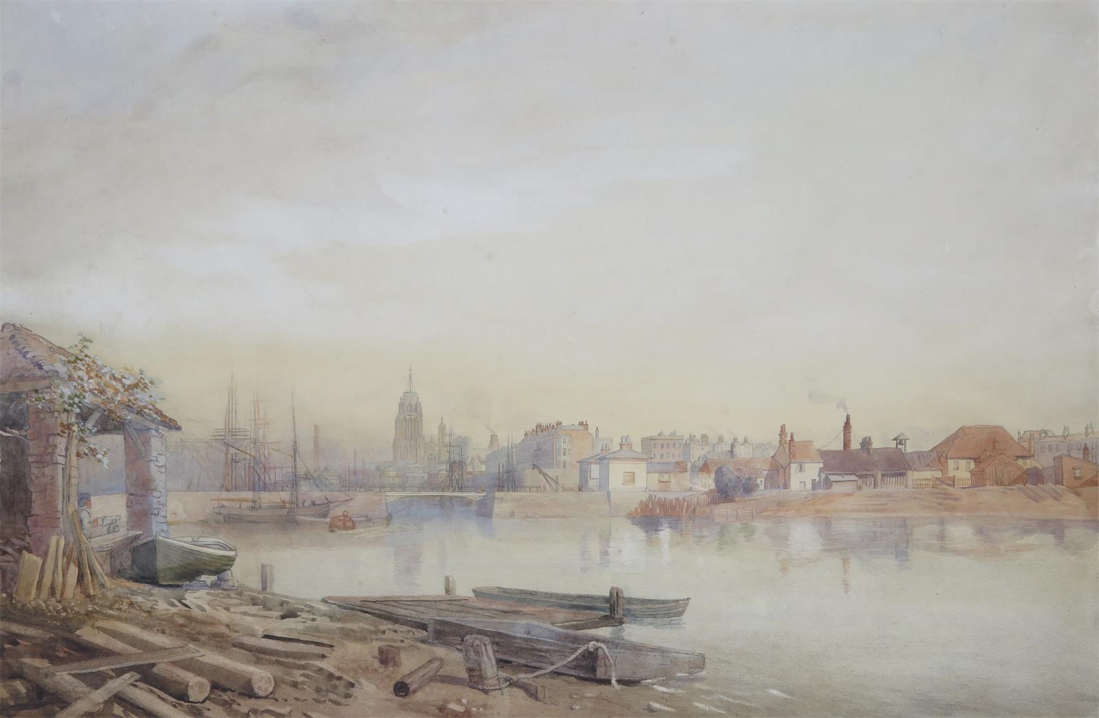 Bristol School 19th Century Bristol docks with St. Mary's Redcliffe in the distance Watercolour...