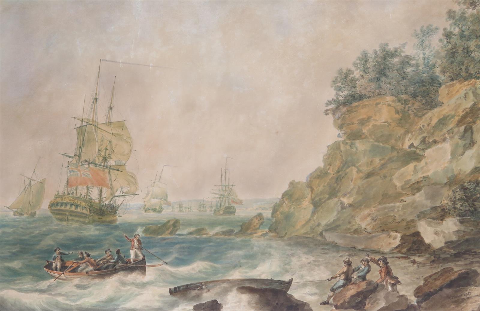 Nicholas Pocock (1740-1821) Shipping off the coast with figures landing on the shore Signed and...