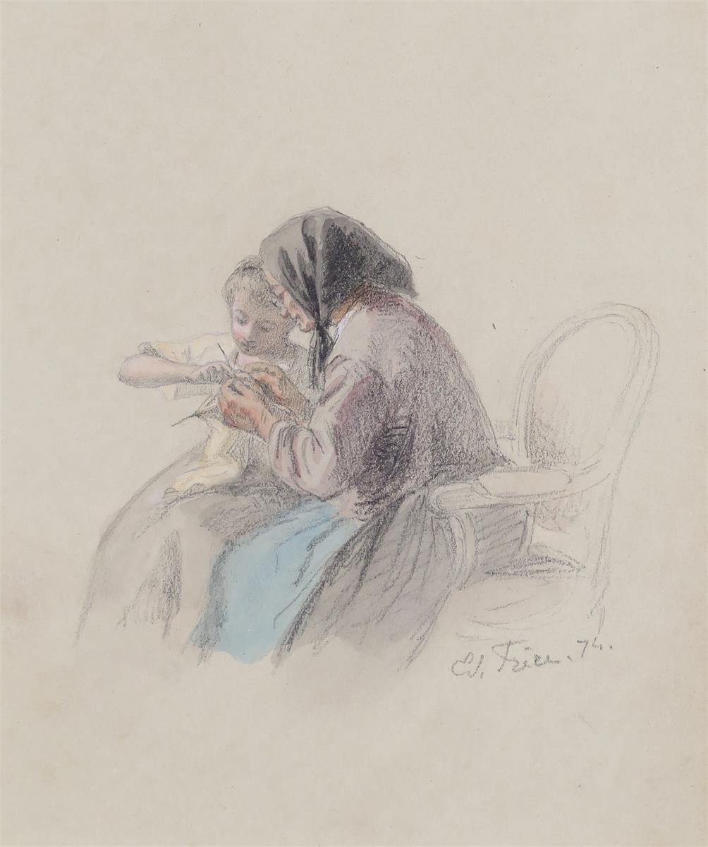 Charles Edouard Frère (French 1837-1894) Tying off the stitch Signed and dated '74 Watercolour...