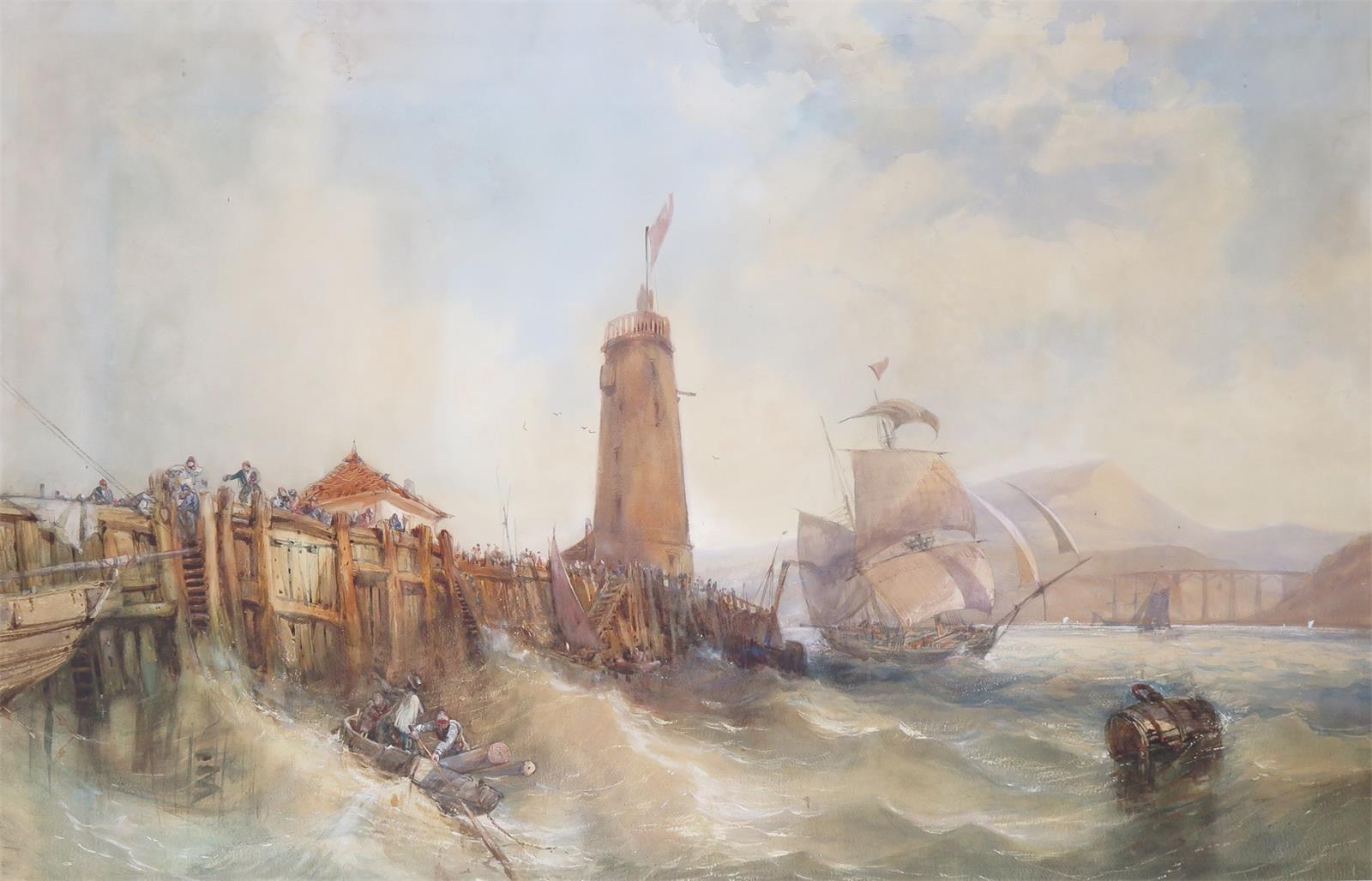 English School late 19th Century Fishing boats by a jetty and lighthouse in a swell Watercolour...