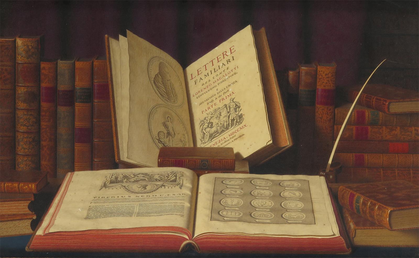 Trompe l'oeil stlll life of antiquarian books with a globe and spectacles; Trompe l'oeil still life of antiquarian books on a table