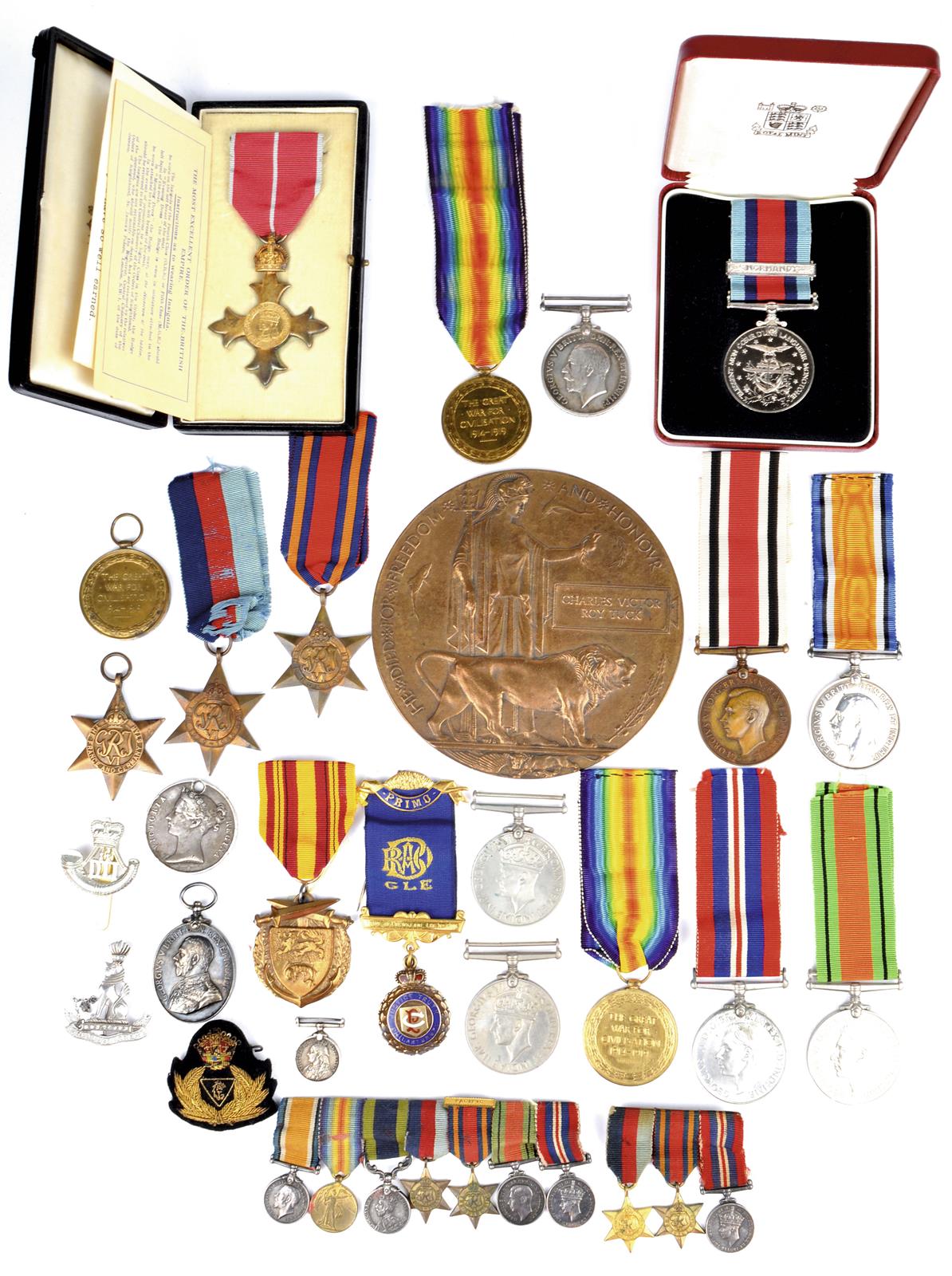 A small collection of medals, including: O.B.E. (Military), attributable to Lt-Col William T. Forsdyke, R.A.S.C., cased with transmission slip, toned, extremely fine; a Great War pair and Memorial Plaque to Charles Victor Roy Tuck, Oxford And Bucks Light Infantry (30118 PTE. C.V.R. TUCK. OXF. & BUCKS. L.I.), good very fine; a Great War Pair (110194 GNR. R.V. TRAVERS. R.A.), very fine; a Territorial Force Efficiency Medal, George V (203895 SJT: R.J. HAMBROOK. 4/ ESSEX R.), nearly extremely fine; two mounted miniature groups; and other items.
