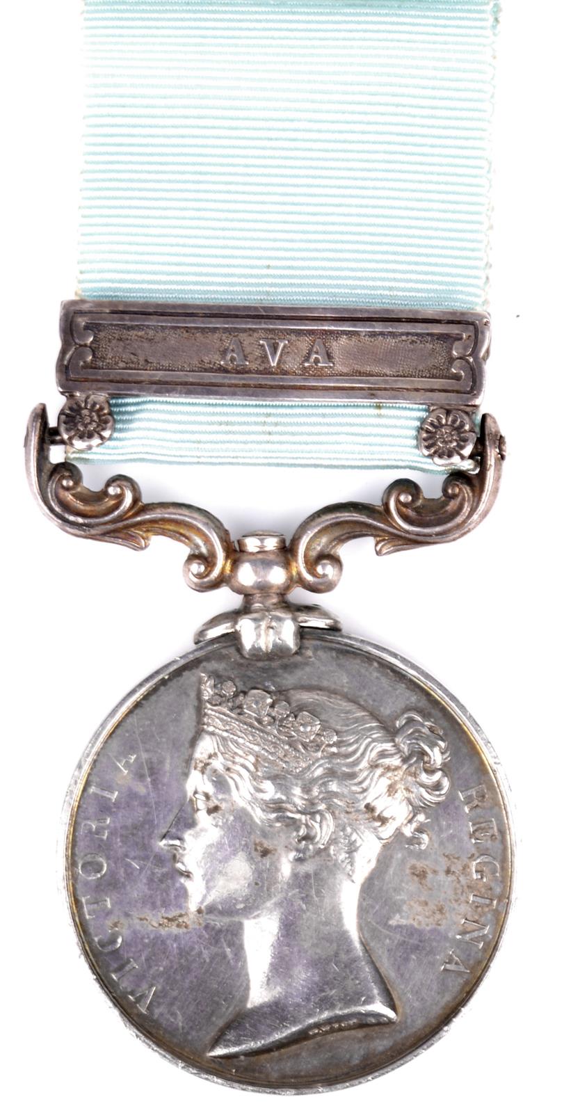 An Army of India Medal, renamed to Jamadar Tucket Ram, Nizam's Artillery, clasp, Ava (JAMADAR TUCKET RAM NIZAMS ARTY) renamed in engraved serif capitals, long hyphen reverse. Good very fine or better, bar re-attached.