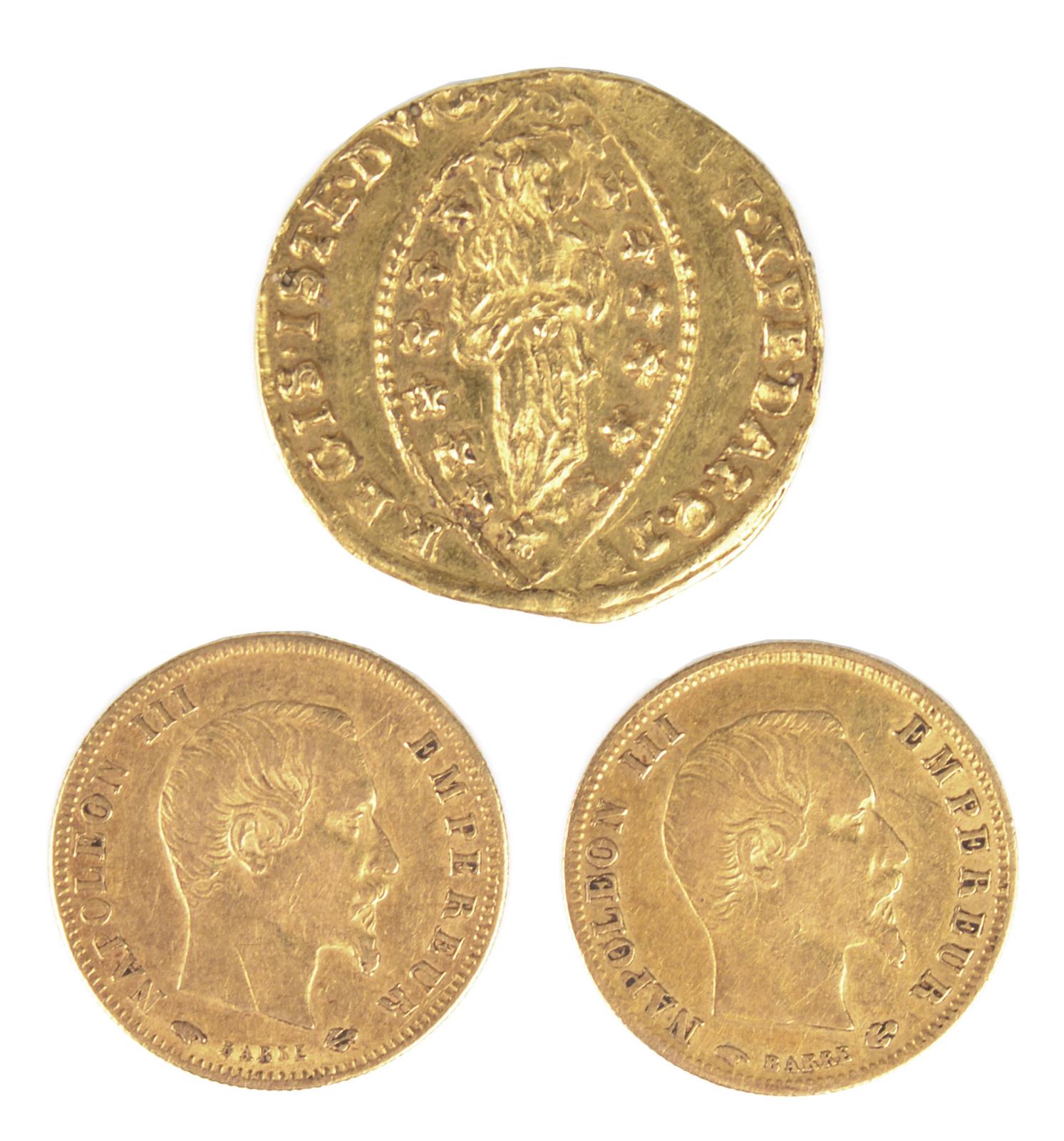 Venice, Doge Ludovico Manin (1789-97), gold zecchino (FF 1445), good fine; France, Second Empire, Napoleon III, gold five francs (2), 1857, 1859, mm A (FF 578a), near very fine. [3]