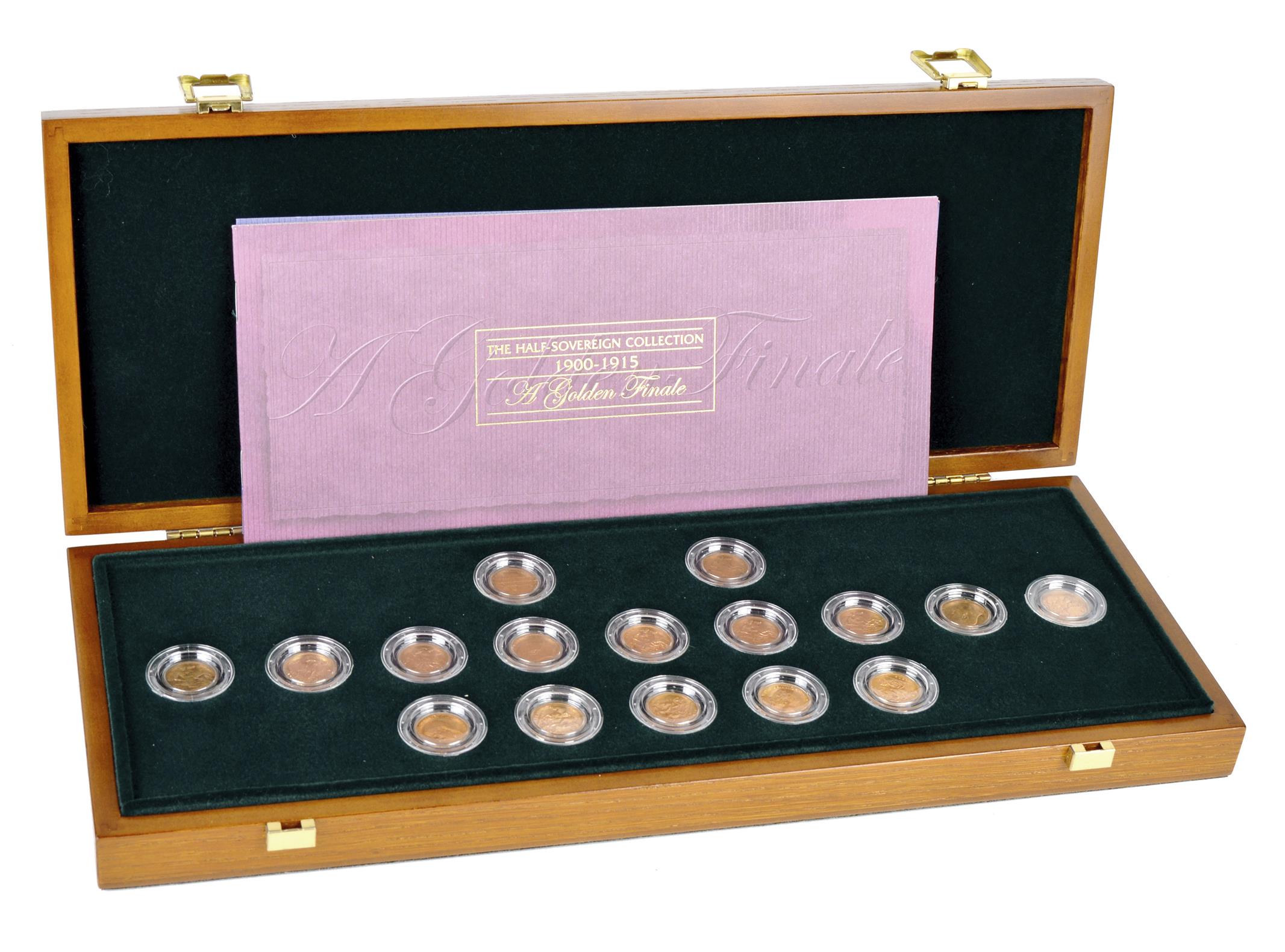 Victoria to George V, a cased collection of sixteen circulated British half sovereigns, one for each year from 1900 to 1915 (the last year in which gold coinage was produced for circulation), issued by the Royal Mint as the 'A Golden Finale' collection, with certificate and promotional booklet, conditions vary from good fine to nearly extremely fine, some signs of possible cleaning. [16]