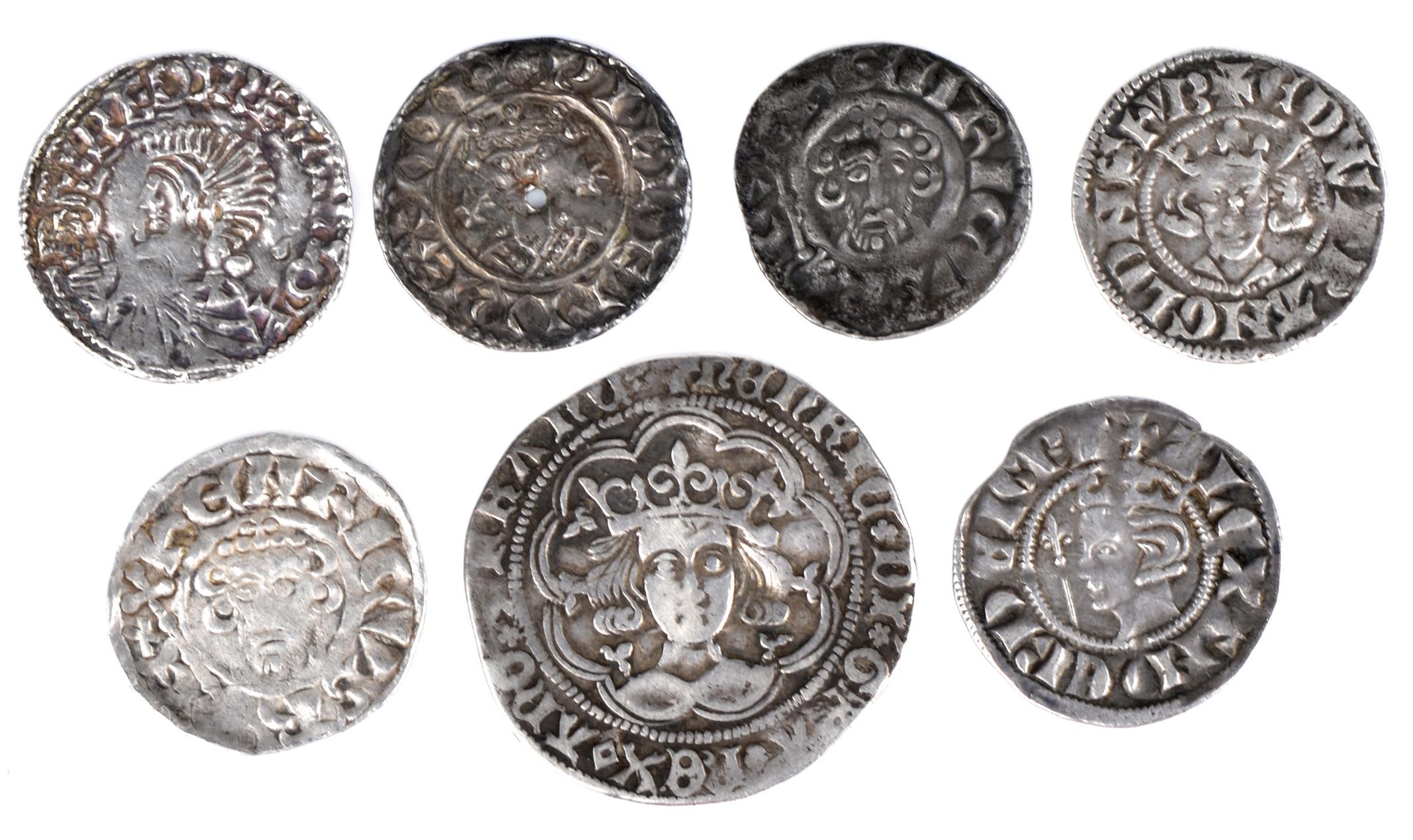 A small collection of mediaeval hammered silver coins, comprising: England: Aethelred II (978-1016), penny, long voided cross, mm cross potent, about fine; William I (1066-87), penny, two stars type (S 1254), pierced through the centre but otherwise good very fine or better; John (1199-1216), pennies (2), fine or a little better; Henry VI, first reign (1422-61), groat, rosette-mascle issue (1430-31), Calais mint (S 1858), good fine; Edward IV (1461-83), penny, long cross issue, mm cross pattee, Canterbury mint, good fine; Scotland: Alexander III (1249-1286), penny, good fine.[7]