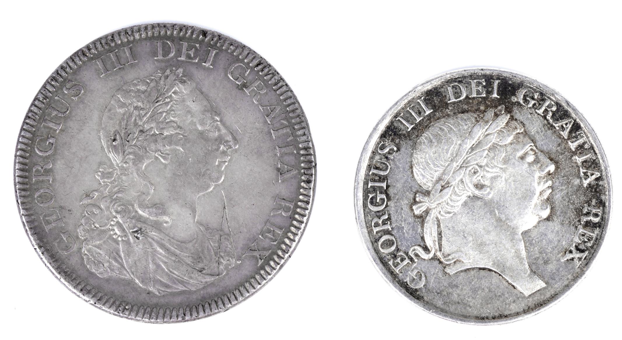 George III, Bank of England issue (1804-16): silver dollar, 1804 (S 3768), good fine or better; silver three shillings, 1814, second head (S 3770), very fine. [2]
