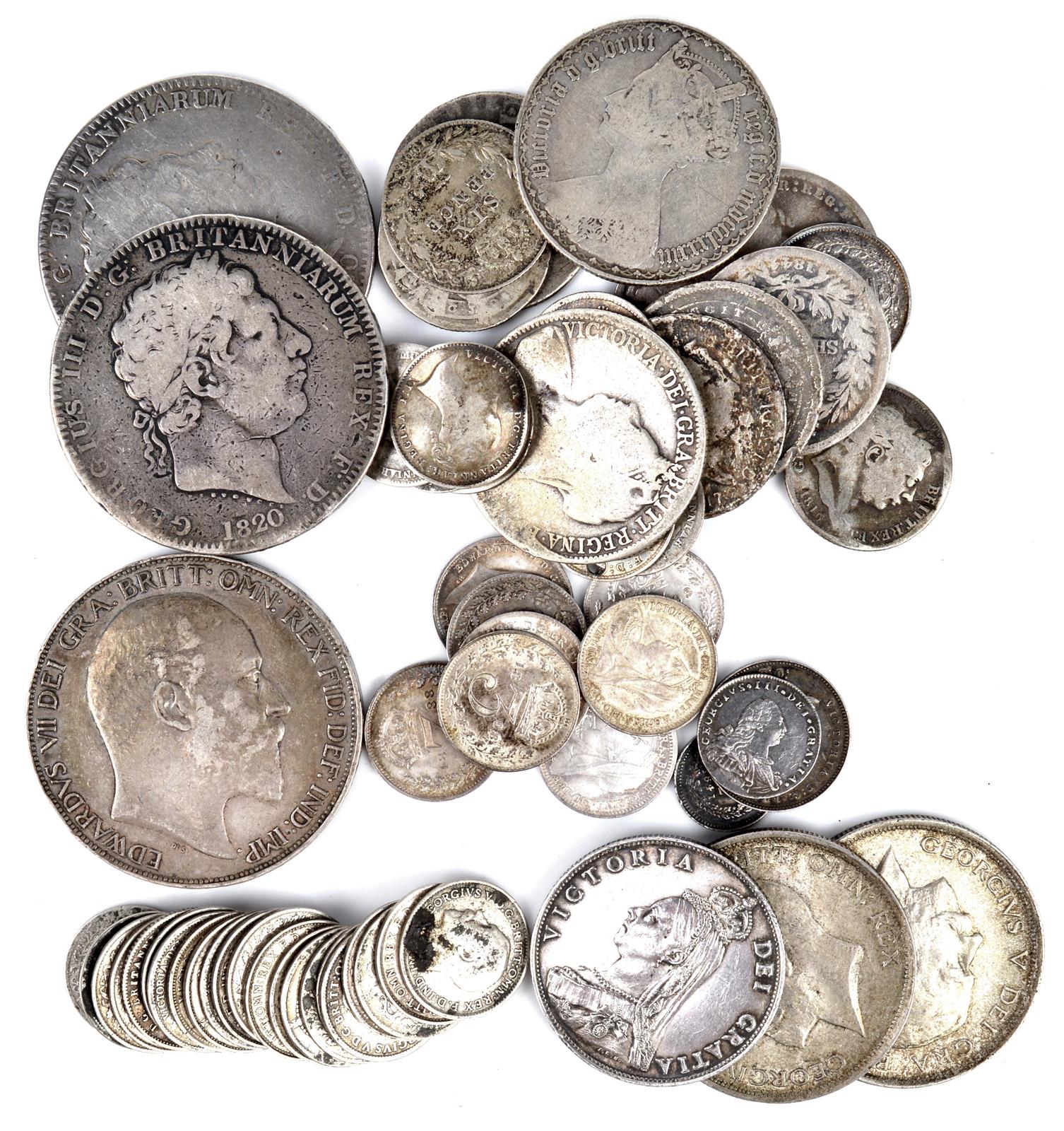 A small collection of silver coins, including: Edward VII, crown, 1902 (S 3978), very fine; Victoria, florin, 1887 (S 3925), good very fine; George V, half-crown (2), 1919 (S 4011) good very fine; Victoria, Maundy fourpence, 1877 (S 3917), about very fine; Maundy threepences (8), various dates 1837-1911, very fine to near extremely fine; George III, twopence, 1800 (S 3758), good fine; Victoria, three-halfpence, 1841 (S 3915), very fine or nearly so; and 46 others, crowns to threepence, various dates, various grades, many poor or only fair. [61]