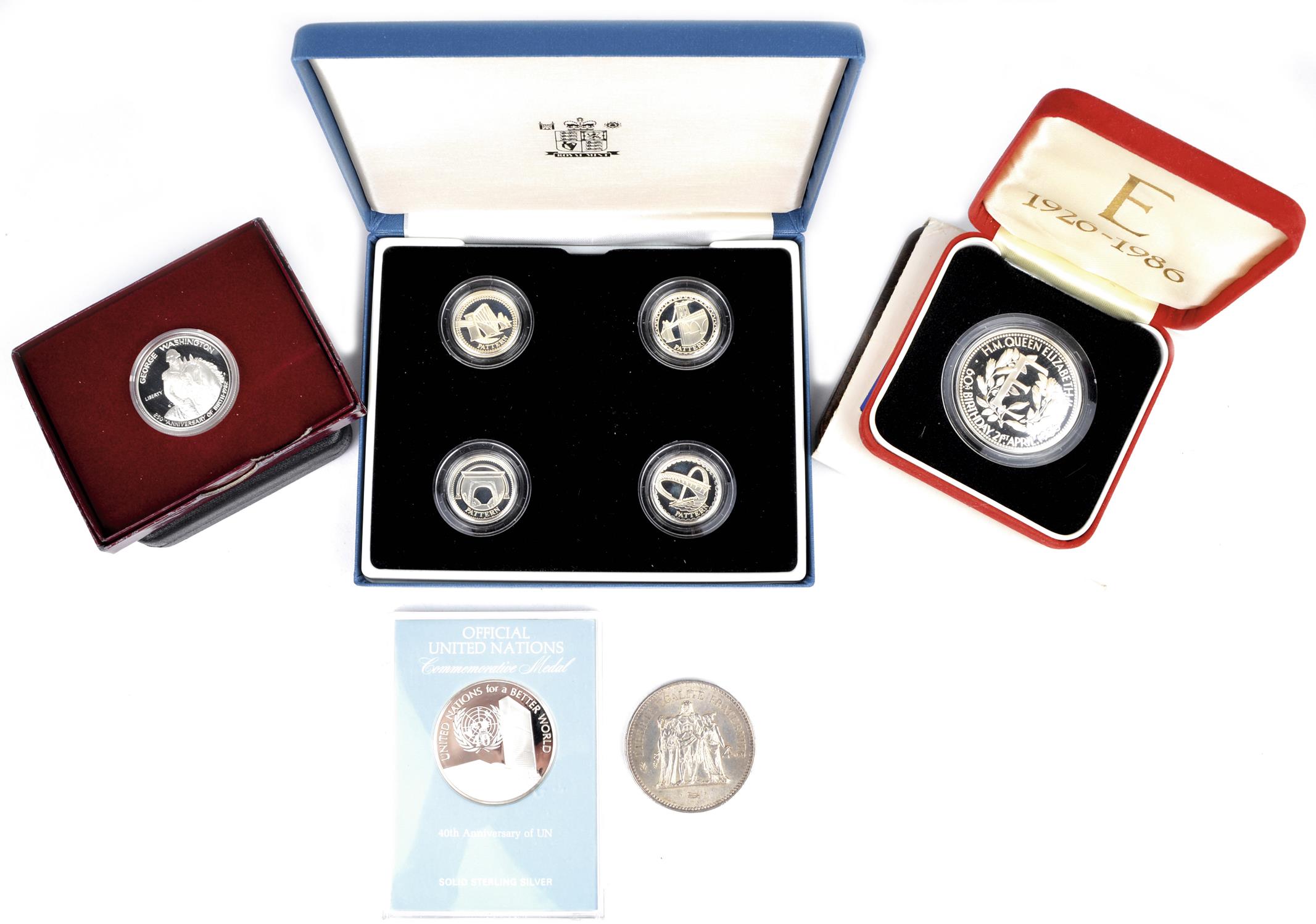 A collection of modern silver proof and commemorative coins, comprising: Britain: 1986, Queen Elizabeth 60th Birthday crown sized medal(unofficial, hallmarked); peidfort two pounds, football, 1996 (S 4317); one pound (4) silver plain edged pattern collection, 2003, hallmarked, all cased and as struck; together with: France: fifty francs, 1976; Bahamas: Fiftieth Anniversary of Independence, ten dollars, cased; U.S.A.: George Washington Half Dollar, 1983, cased; United Nations Fortieth Anniversary, 1985, encapsulated crown sized medal. [10]