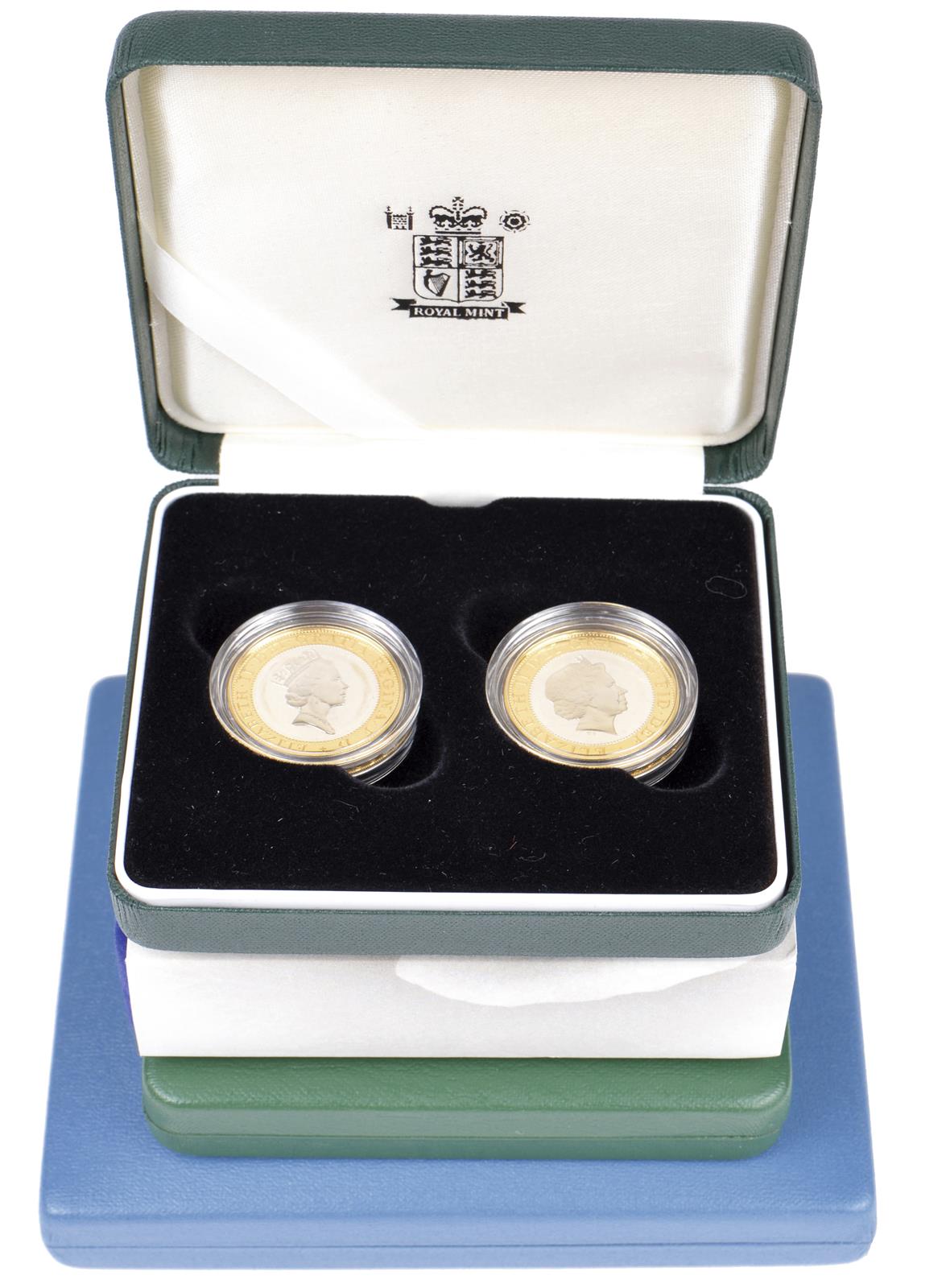 A collection of modern British silver proof coins: piedfort one pound (4), 1994, 1995, 1996 and 1997, cased together (S 4337-40); two pound two coin set, 1997-98 (S 4318, 4570); fifty pence two coin set, 1997 (S 4351, 4354); Diana Princess of Wales commemorative five pounds (S 4551), all cased and with Royal Mint certificates, all as struck. [9]
