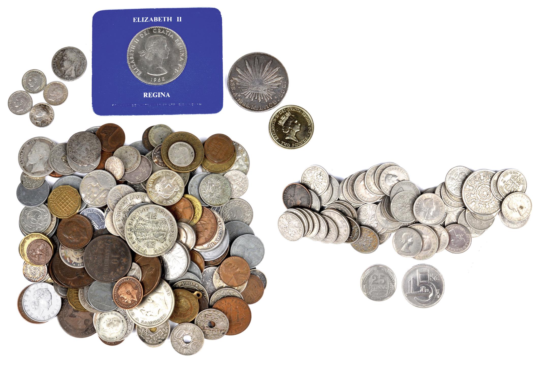A small collection of coins, mainly British late pre-decimal, some foreign, mainly base metal.