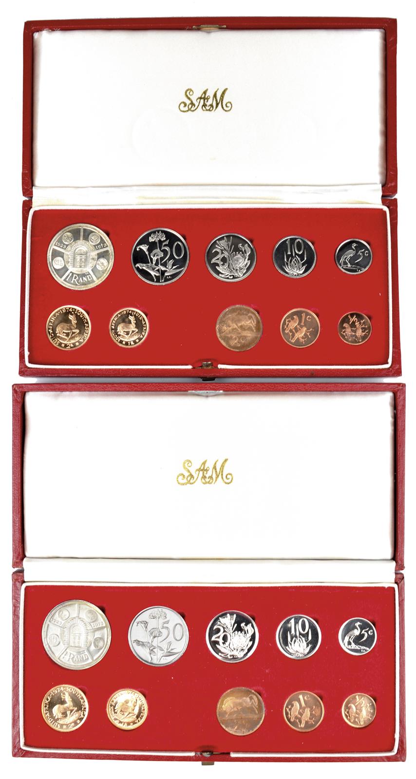 Republic of South Africa, two proof sets, each ten coins, gold two rand and rand, silver rand to bronze half cent, extremely fine, cased.