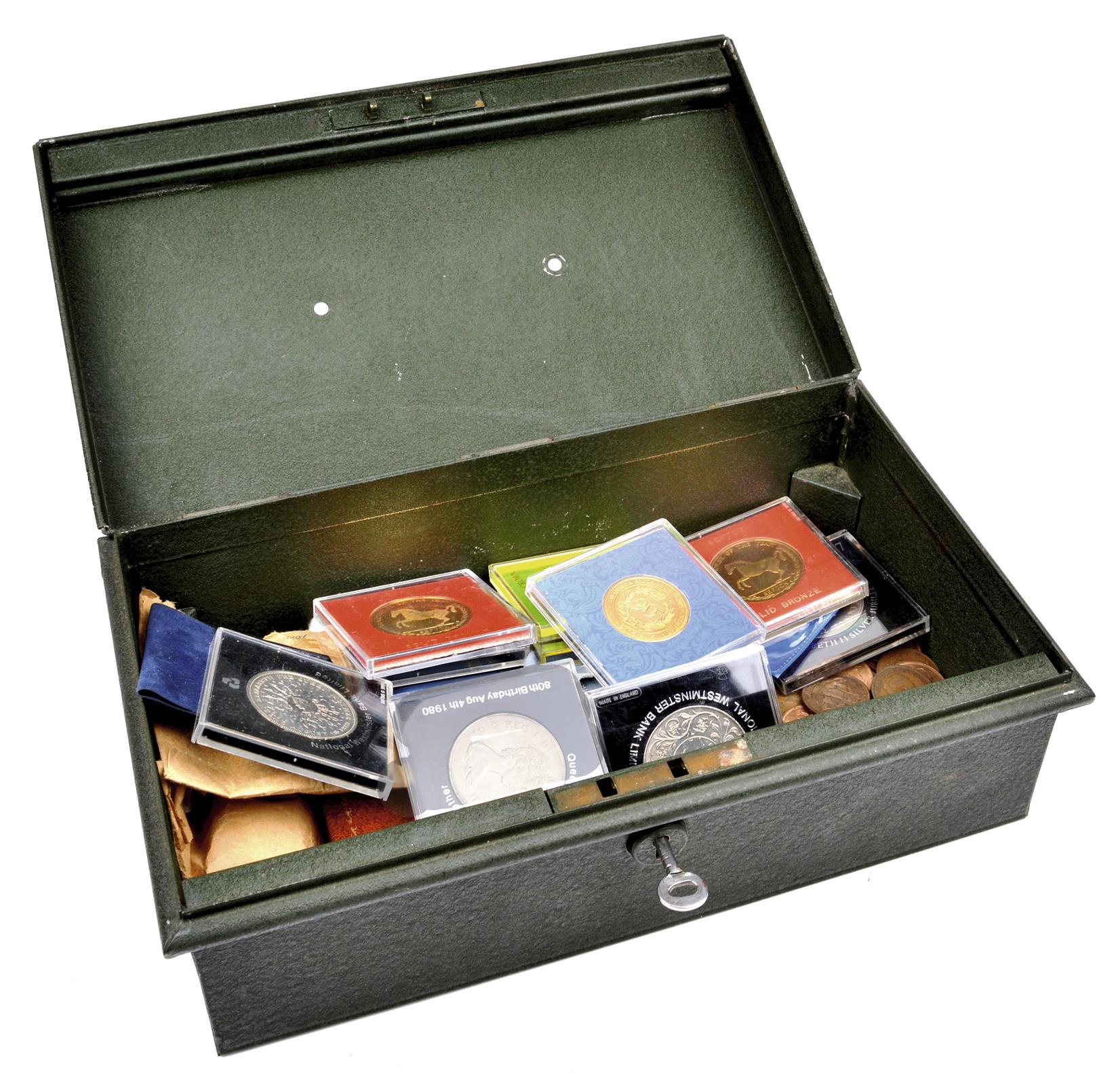 A collection of British coins, including numerous late pre-decimal pence and half pence, many nearly extremely fine; commemorative crowns, specimen sets, and others.