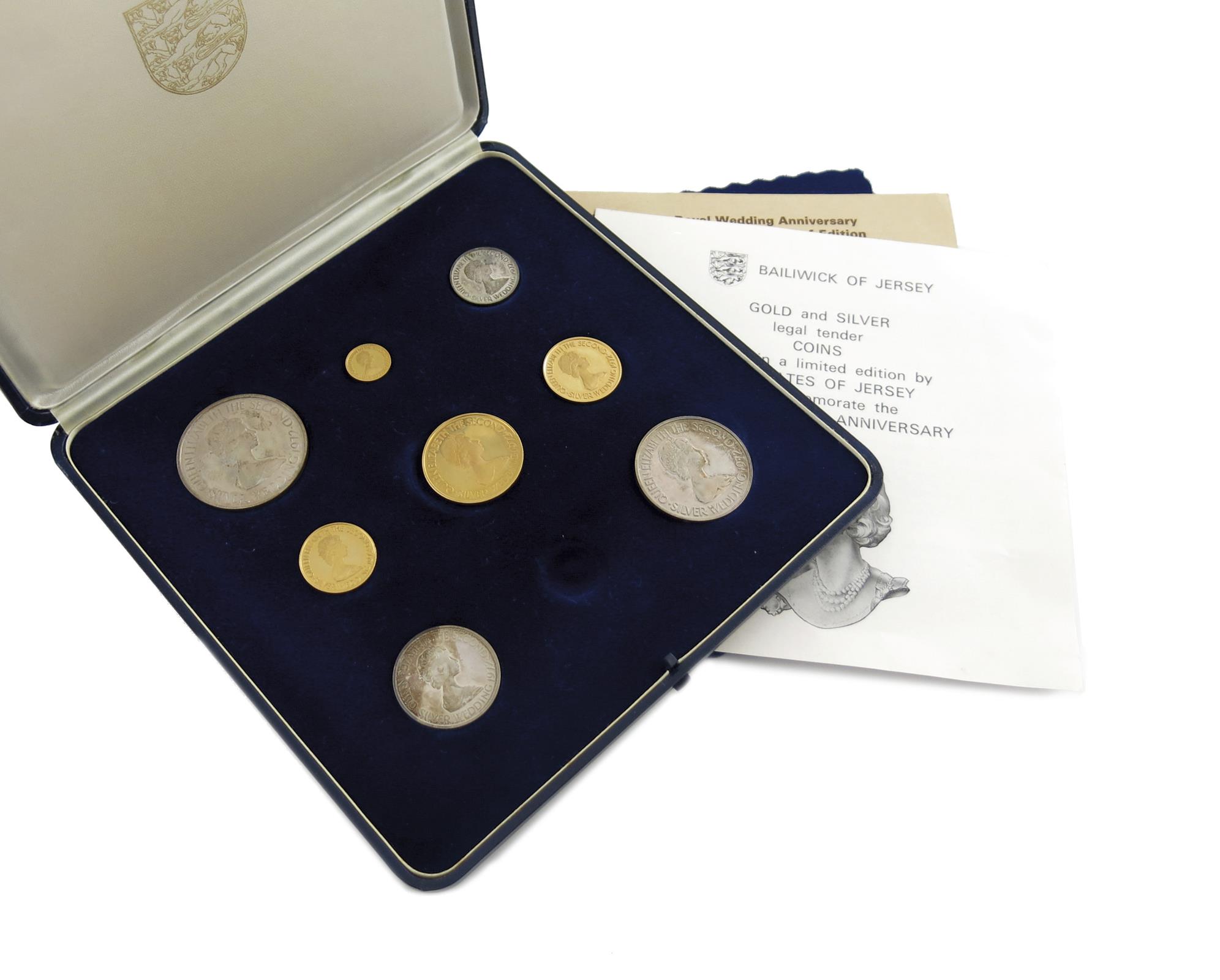 Jersey, Elizabeth II, Royal Wedding Anniversary, 1972, Proof Set of coins, gold 50-, 25-, 20-, and 5-Pounds (lacks 10-Pounds), silver from £2.50 - 50p (KM PS 6), in case of issue, with certificate. Virtually mint state. (8)
