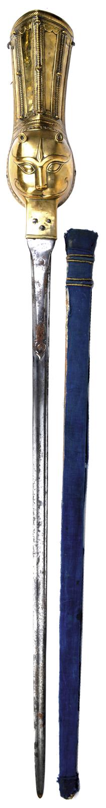 An Indian gauntlet sword (pata), the slender bi-fullered blade 32 in. and probably adapted from a European sword, united to the brass hilt by two long steel flanges, hilt with tiger mask hand guard, the wrist section divided into longitudinal panels between ornate ribbed and beaded borders, the interior of the hilt with wooden transverse grip and velvet and leather pad(possibly later), articulated iron arm band, possibly 18th Century Mysore or Tranvancore, blue cloth covered scabbard.